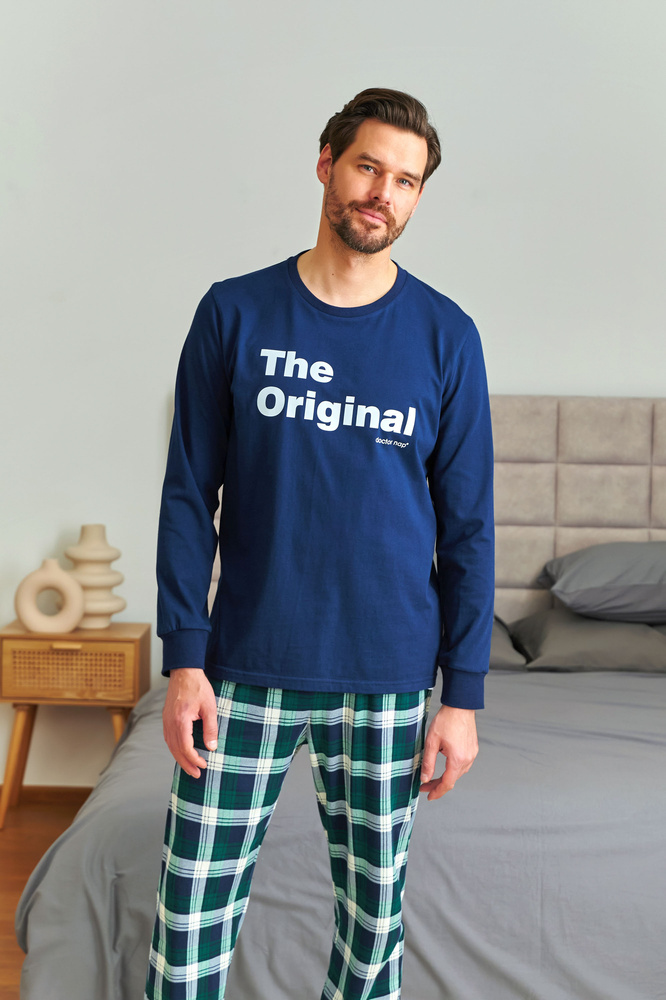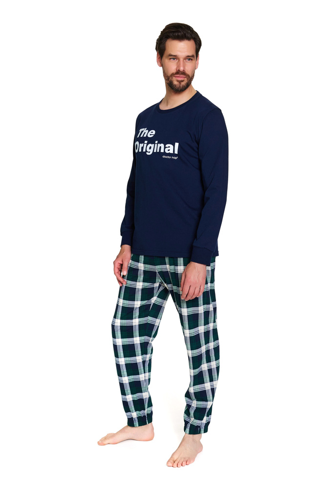 Мъжката пижама Doctor Nap 7341 е стилен комплект, идеален за всеки сезон. Състои се от памучна блуза с дълъг ръкав и щампа "The Original" и класически панталон на каре с рипсен подгъв. Този модел е част от семейната колекция - можете да изберете подходящи комплекти за вашия партньор и дете, създавайки едно цялостно, модерно цяло за вечери или снимки заедно. Полското производство гарантира качество и комфорт.