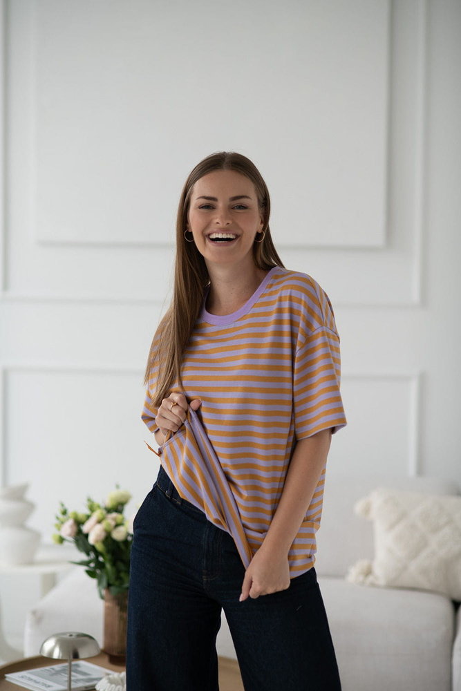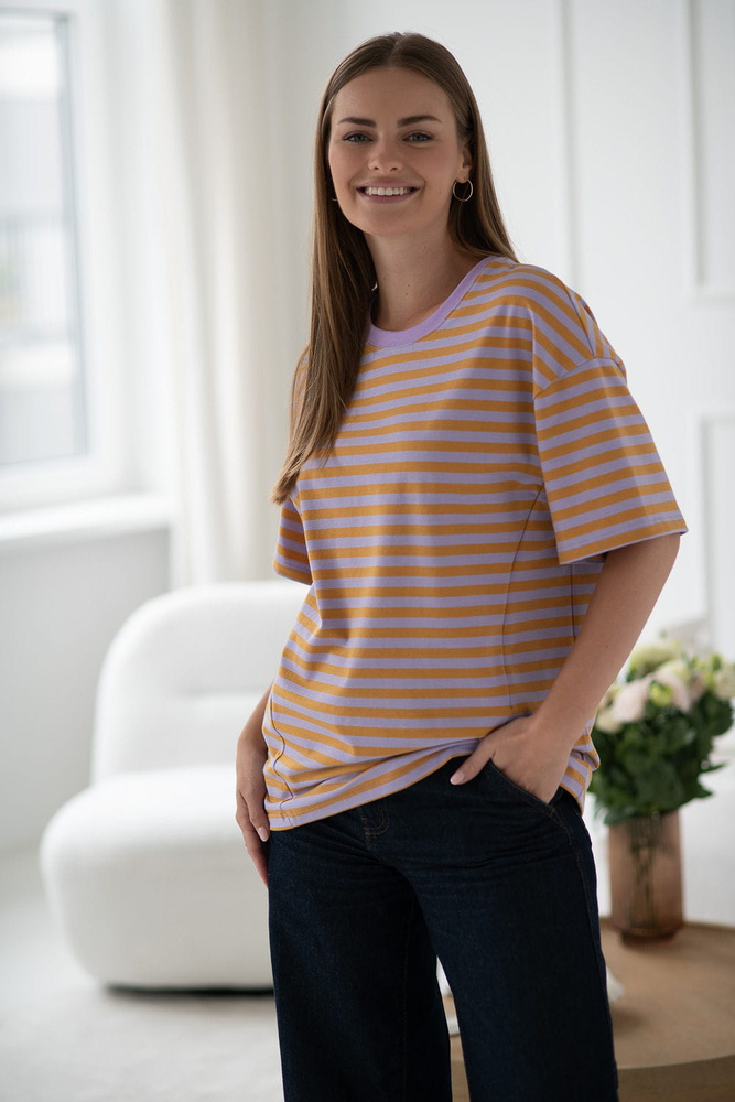 Тениска за бременност и кърмене Mamahood Milk&Love, медено и лилаво райе – удобно и стилно