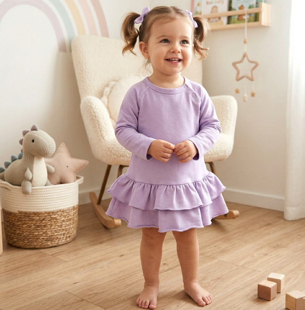 Лилавата бебешка рокля Underwater World от Nini с дълъг ръкав е елегантен и удобен вариант за най-малките. Изработен от 100% органичен памук, той е мек, щадящ чувствителната бебешка кожа и позволява на кожата да диша. Свободната кройка с очарователен волан осигурява комфорт при носене и свобода на движение. Изчистената, едноцветна форма прави роклята идеална както за ежедневно носене, така и за специални поводи.