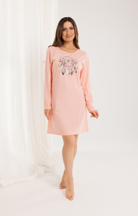 162 Памучна нощница Regina, цвят кайсия – дълъг ръкав, щампа, над коляното
