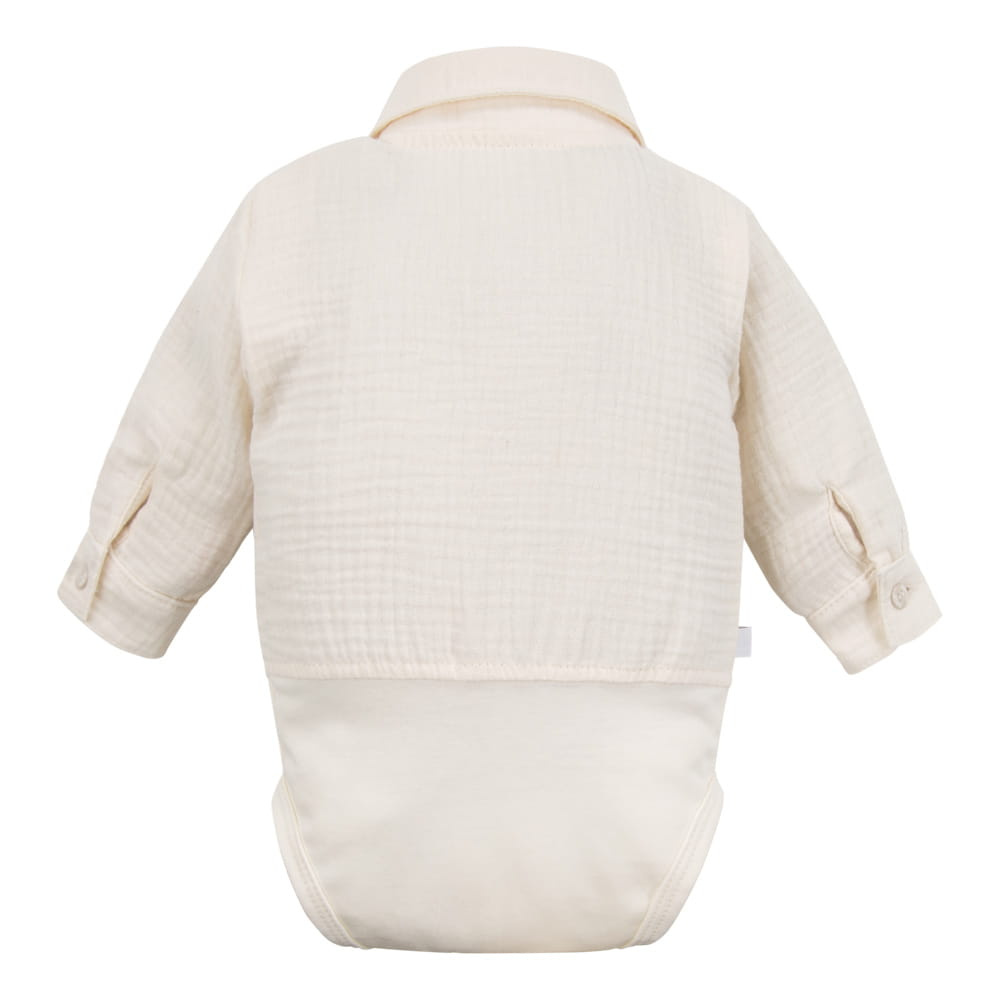 Бодито е с класическа кройка на риза с яка, което му придава елегантност и в същото време остава функционално - благодарение на закопчаването на чатала и на рамото, обличането на вашето дете е бързо и удобно. Материята муселин е лека, ефирна и щадяща нежната бебешка кожа.