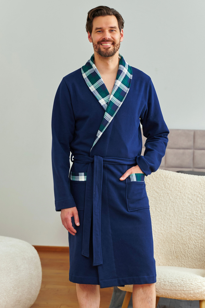 • Благороден по форма, приятен на допир. Стилен мъжки халат с елегантни акценти на каре. 100% памук за ежедневен комфорт.