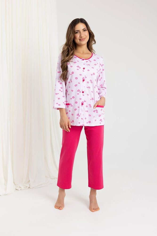 723 Дамска пижама Regina, розово – памук, 7/8 ръкав, копчета, комфорт и стил