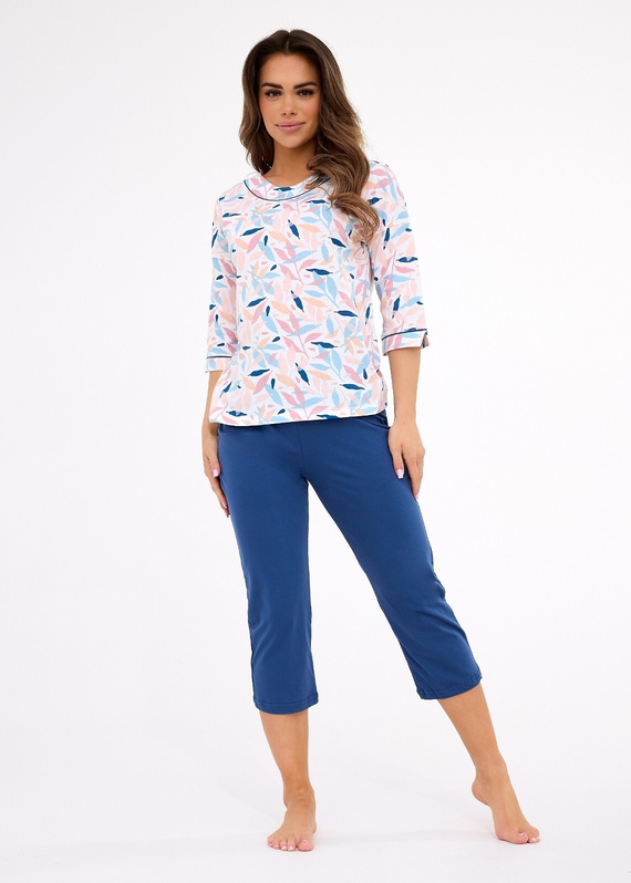 Блуза с 3/4 ръкав е практично решение за всеки сезон - нито много топло, нито много студено. Дължината на панталона 3/4 пасва перфектно, а еластичната талия осигурява свобода на движение и удобство при носене. Деликатният десен и внимателната обработка придават чар и лекота на пижамата.