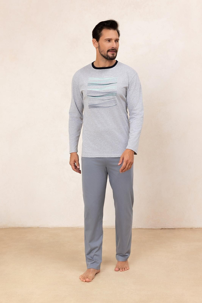 Regina 492 сиво – мъжка памучна пижама с дълъг ръкав класическа кройка