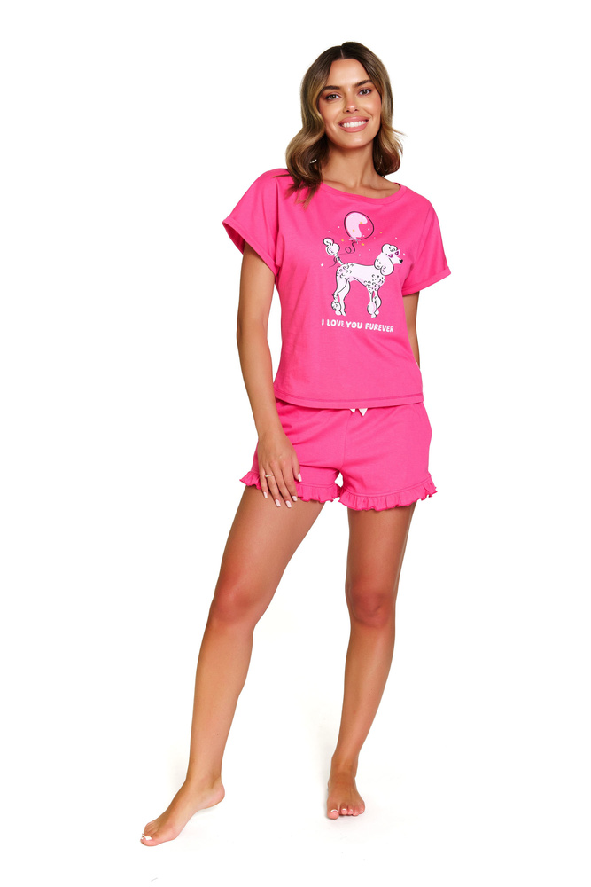 Doctor Nap 7357 е дамска пижама, съчетаваща комфорт с момичешки чар. Изработен от висококачествен, мек памук, идеален за летните вечери и сутрини. Тениската с къс ръкав е декорирана с очарователна щампа с пудел и надпис "I love you furever". Къси шорти с волан и сатенен лък придават лекота и чар. Това са идеалните пижами за жени, които обичат да си играят с модата - също и у дома.