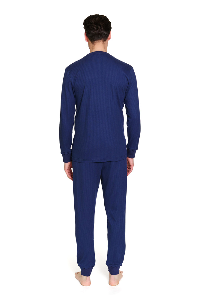 Модел 7350 от Doctor Nap е класическа мъжка пижама, изработена от приятна, рипсена памучна материя. Горнището с дълги ръкави и обло деколте приляга идеално по тялото, а панталонът с маншет не се навива по време на сън. Идеално предложение за есента, зимата и прохладните вечери. Семплият, но стилен дизайн ще работи както у дома, така и като част от семеен комплект (налични дамски и детски варианти).