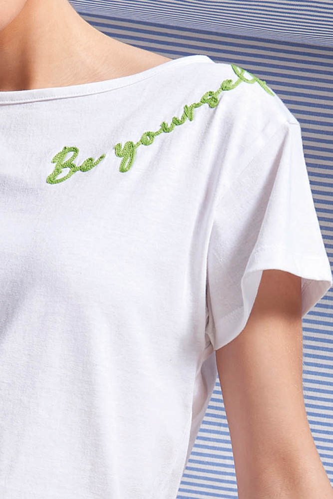 - Пижама Sunari Sorbetto от две части с тениска и шорти. Памучна, лека, с бродерия и карета. Удобен комплект за топлите нощи.