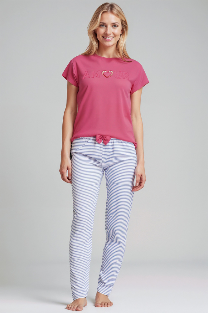 Juliana Sorbetto pink – дамска пижама 100% памук, с бродерия и панталон на дълги райета