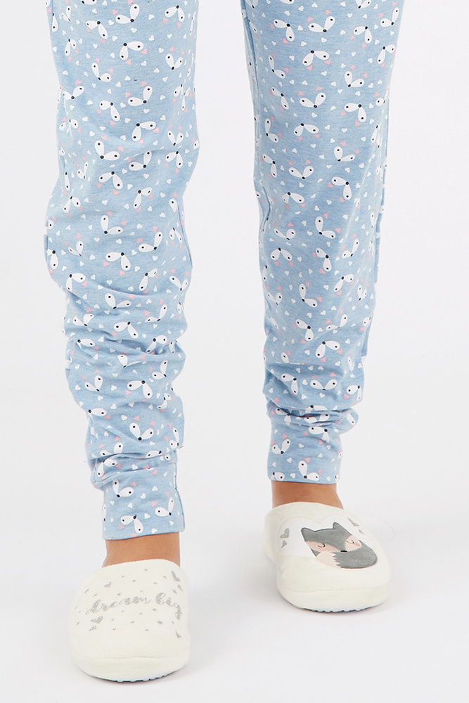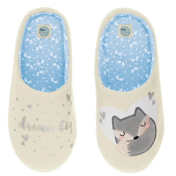 • Меки дамски чехли с гъвкава стелка и неплъзгаща се подметка. Декориран с принт и 3D апликация. Перфектен за студените дни. Състав: 100% полиестер.