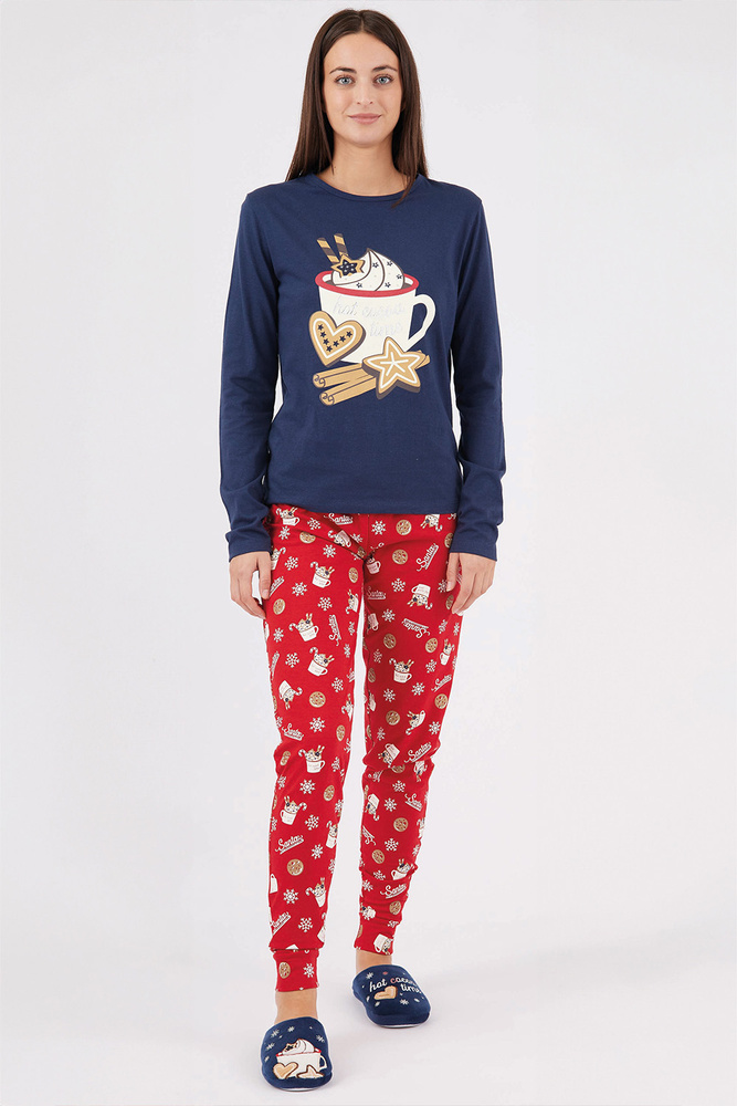 Горнището на пижамата е класическа блуза с дълъг ръкав и кръгло деколте, декорирана с коледен принт, който придава нотка зимна магия на релакса у дома.