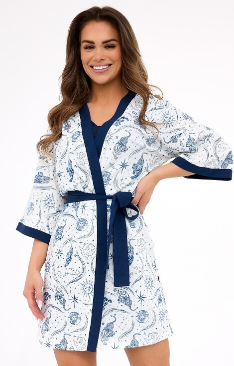 • Халат Olivia от колекция Dream Lady на Cornette е къс, памучен модел със 7/8 ръкав, връзващ се на талията. Декориран с принт на звезди и завършен с равномерни шевове.