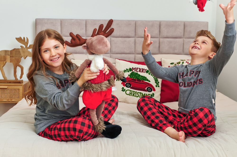 Сив топ с щампа "Весели празници" създава празнично настроение, а панталоните на червено и черно каре придават стил и радост. Свободната кройка не ограничава движението, така че пижамата е идеална и за игра у дома.