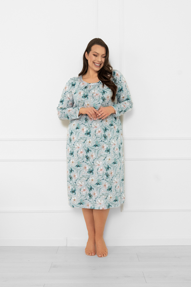 Моделът е със свободна кройка и дълги ръкави, което го прави идеален избор за по-хладните нощи. Кръглото деколте е украсено с деликатна гънка и сатенен кант с панделка, които придават на ризата романтичен и женствен вид. Цялостният дизайн е в пастелни тонове с фин флорален принт, който подчертава лекотата и елегантността на.