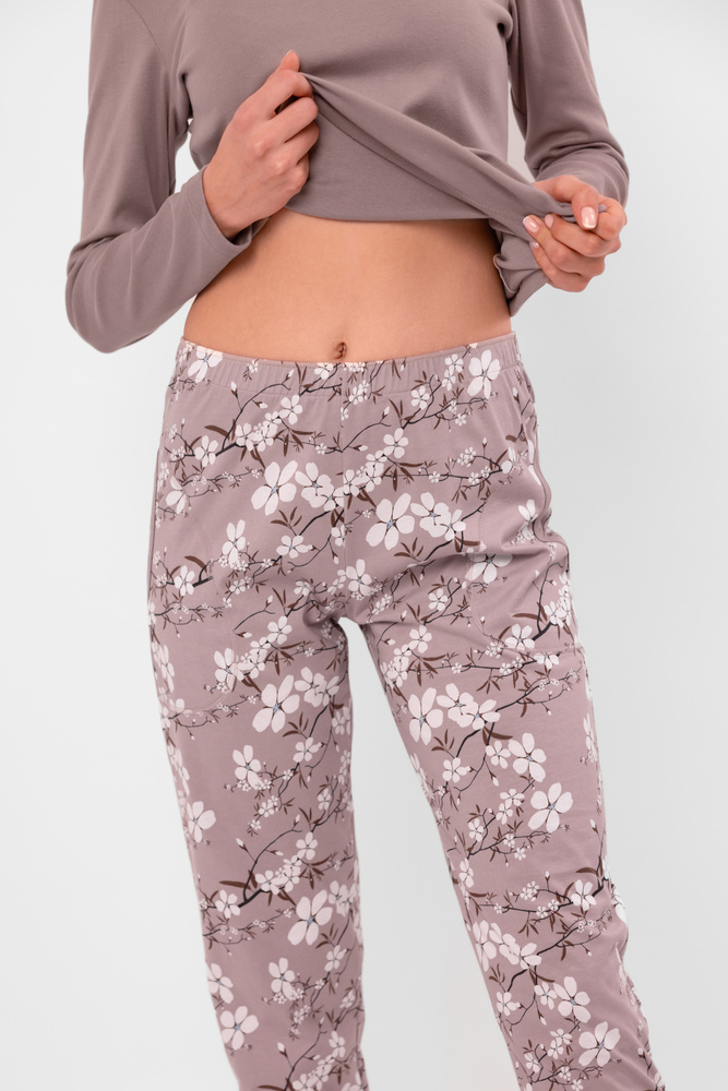 • Дамска пижама Kimuri от памук, цвят капучино. Блуза с дълъг ръкав и панделка на деколтето, панталон с флорален принт, джобове и еластична талия.