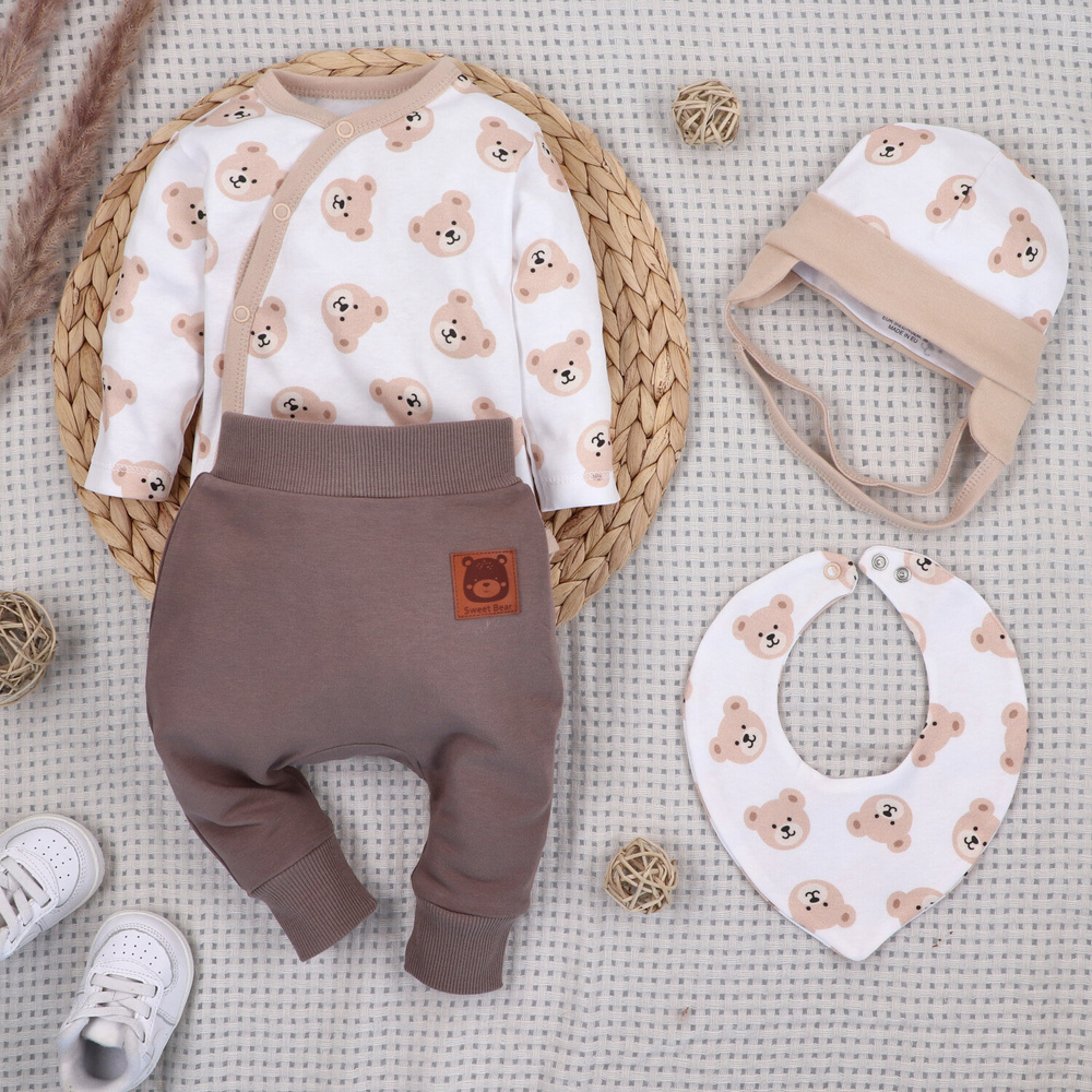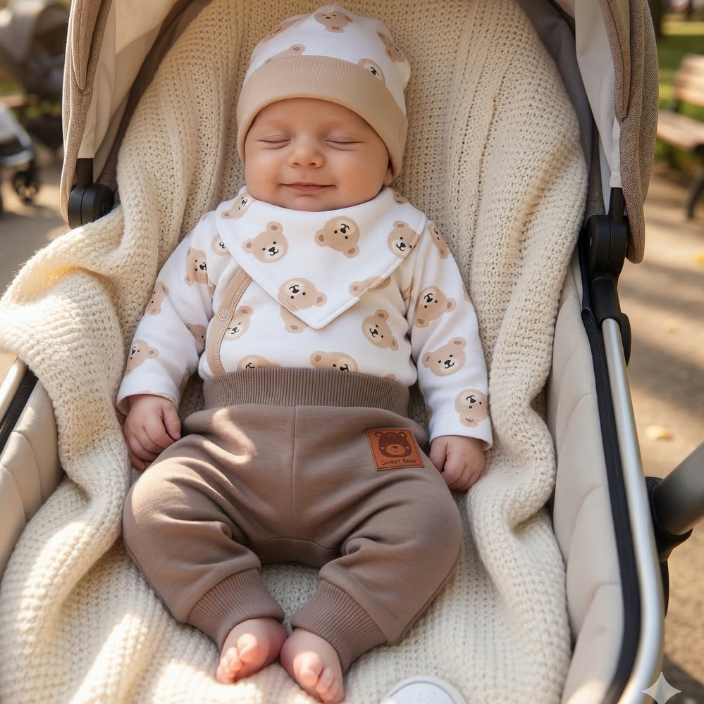Бебешкият комплект Nini Sweet Bears е изработен от най-висококачествен органичен памук, което го прави изключително мек, дишащ и приятен за кожата. Това е екологичен избор за родители, които ценят комфорта, безопасността и естествените материали.