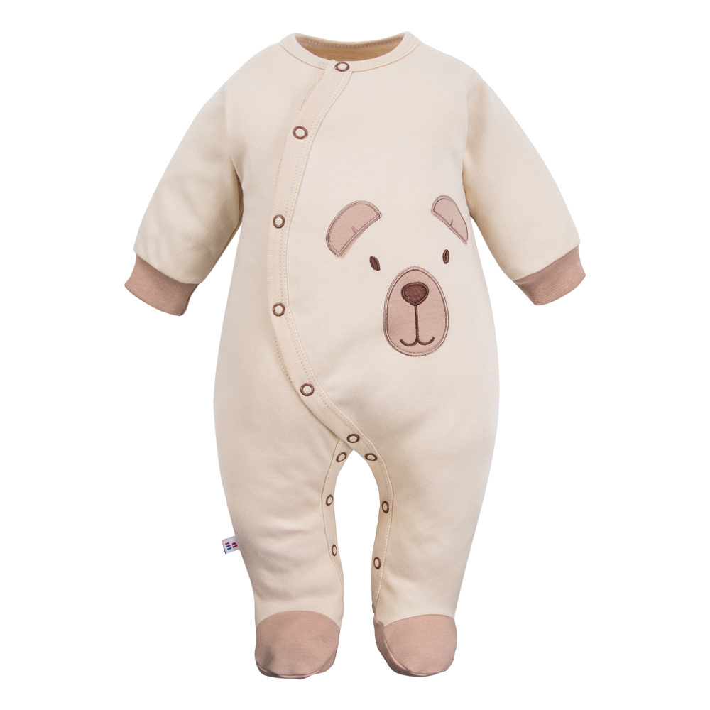 Model w kolorze ecru ozdobiono uroczym haftem misia oraz kontrastowymi lamówkami, które dodają mu subtelnego charakteru. Zabudowane stópki zapewniają maluszkowi ciepło, a praktyczne zapięcie na całej długości na bezniklowe napy ułatwia szybkie i wygodne przebieranie – także w nocy.