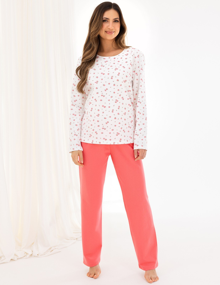 717 Дамска пижама Regina, цвят корал – топъл памук, дълъг ръкав, цветя