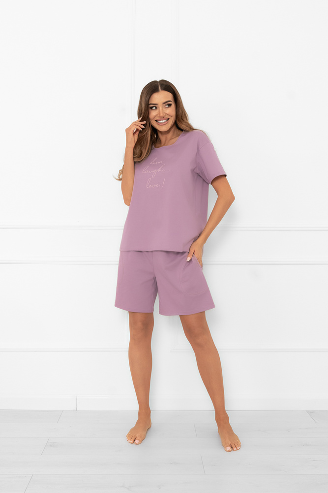 Тениската с къс ръкав е с класическо кръгло деколте и фин принт на гърдите, който придава лекота и момичешко излъчване. Къси панталони с практични странични джобове гарантират свобода на движенията и комфорт както през нощта, така и когато си почивате у дома.