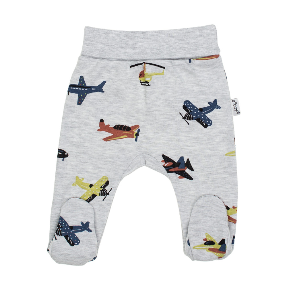 • Памучен гащеризон Nicol Willy в сиво с щампа на самолет. Удобен колан, покрити крака, размери 56–68.
