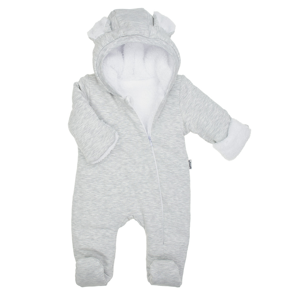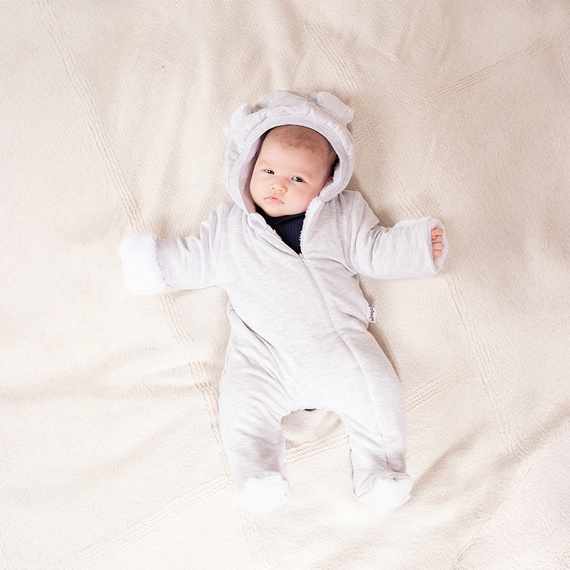 Светлосивият модел се отличава с очарователни ушички на качулката, които придават на всичко неповторимо очарование. Гащеризонът е с покрити крака и навити ръкави. Дългият цип улеснява бързото преобличане. Това е практично и стилно облекло за най-малките.