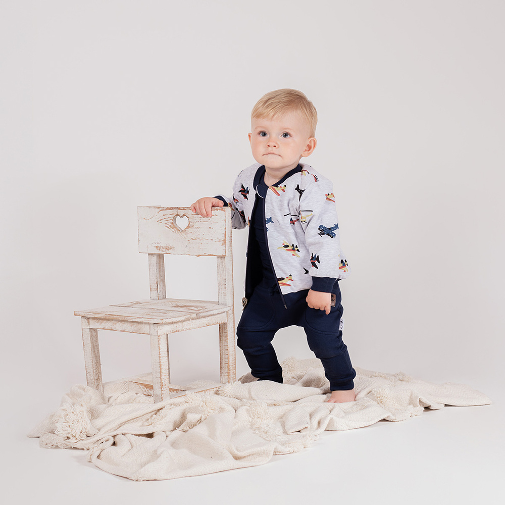 Тъмносиният цвят е универсален и лесно се съчетава с други елементи от гардероба. Моделът е снабден с практични джобове и ластичен колан с декоративен шнур, който гарантира перфектно прилягане. Връзките на крачолите държат панталона на място. Перфектен избор за ежедневието, за игра, детска градина или разходка.