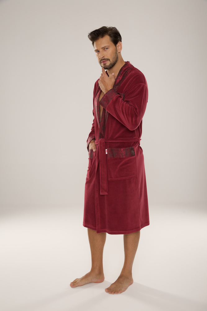 868 Благороден мъжки велурен халат De Lafense - елегантен, мек, първокласен, цвят бордо