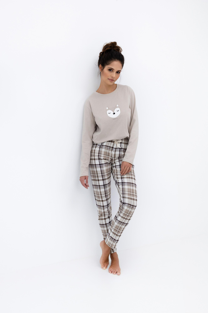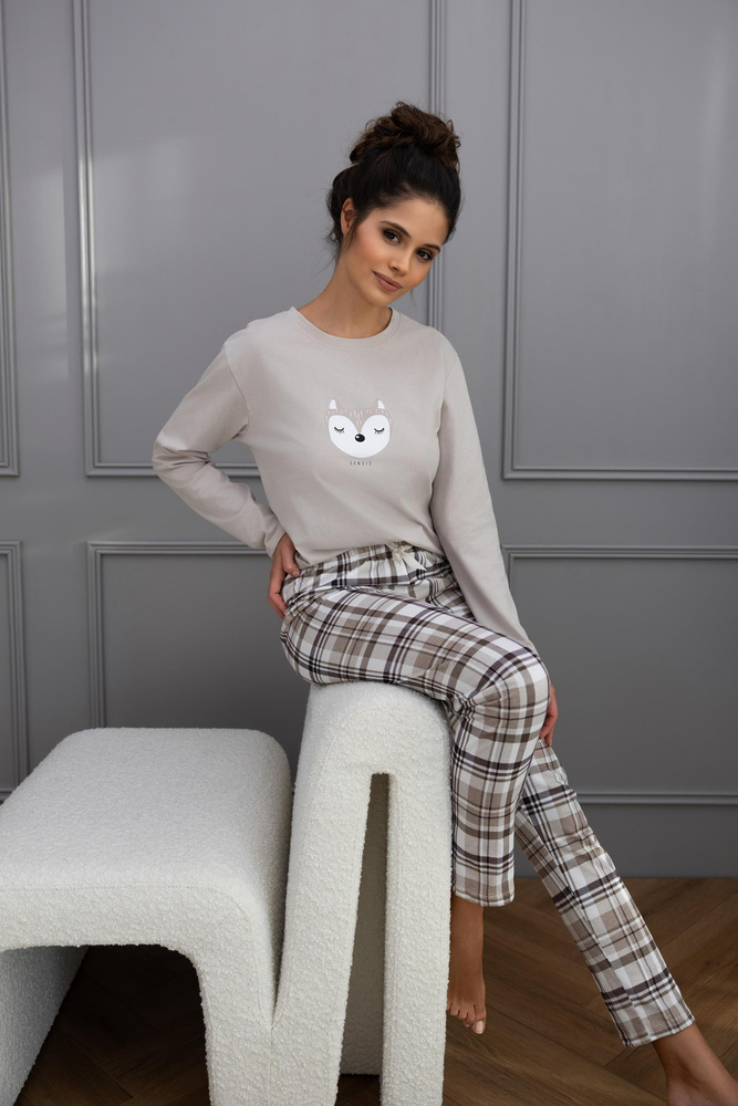 Горнището е тениска с дълъг ръкав и кръгло деколте, украсено с цветен принт отпред, който придава момичешко излъчване на цялостната визия. Комплектът се предлага с дълги карирани панталони с еластична талия и декоративна сатенена панделка за удобен и естетически издържан външен вид.