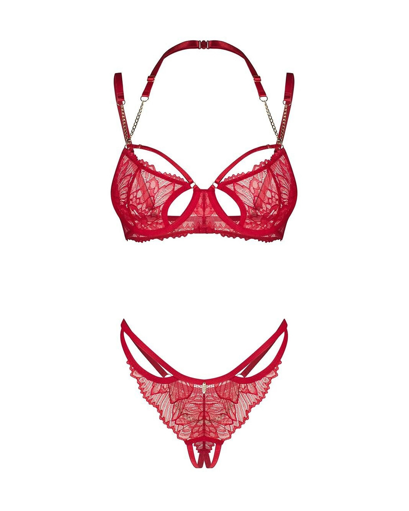- Чувственият комплект Obsessive Matildea: сутиен с банели и отворени прашки. Дантелена кант и закопчаване отзад.