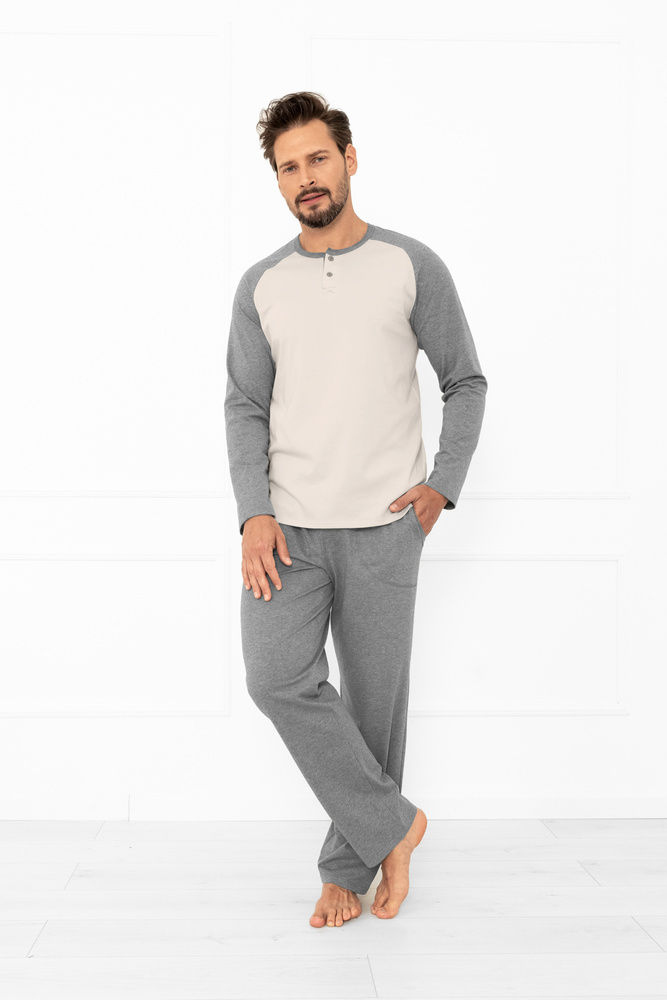 Суитшърт с реглан ръкави в контрастни цветове, кръгло деколте с кант и практично закопчаване с поло копчета. Плътните панталони са с прав крачол и два вградени джоба, завършени с декоративни шевове.