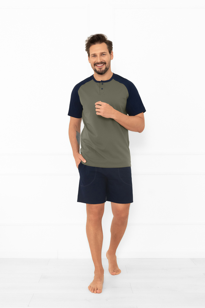 Удобен и стилен мъжка пижама Alexander е идеалният избор за по-топлите нощи. Изработен от висококачествен, дишащ памук, той гарантира комфортен сън и пълна свобода на движенията. Комплектът се състои от тениска с къс ръкав и къси панталони, което го прави идеален за лятото и за работа в гореща среда.
