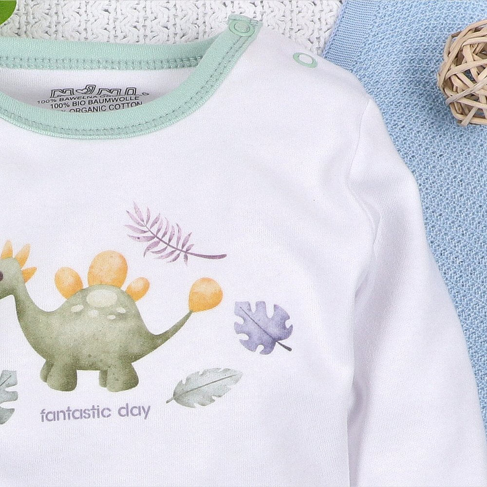 • Бебешко боди Nini Dino Explorer – 100% органичен памук, дълги ръкави, удобно закопчаване с тик-так.