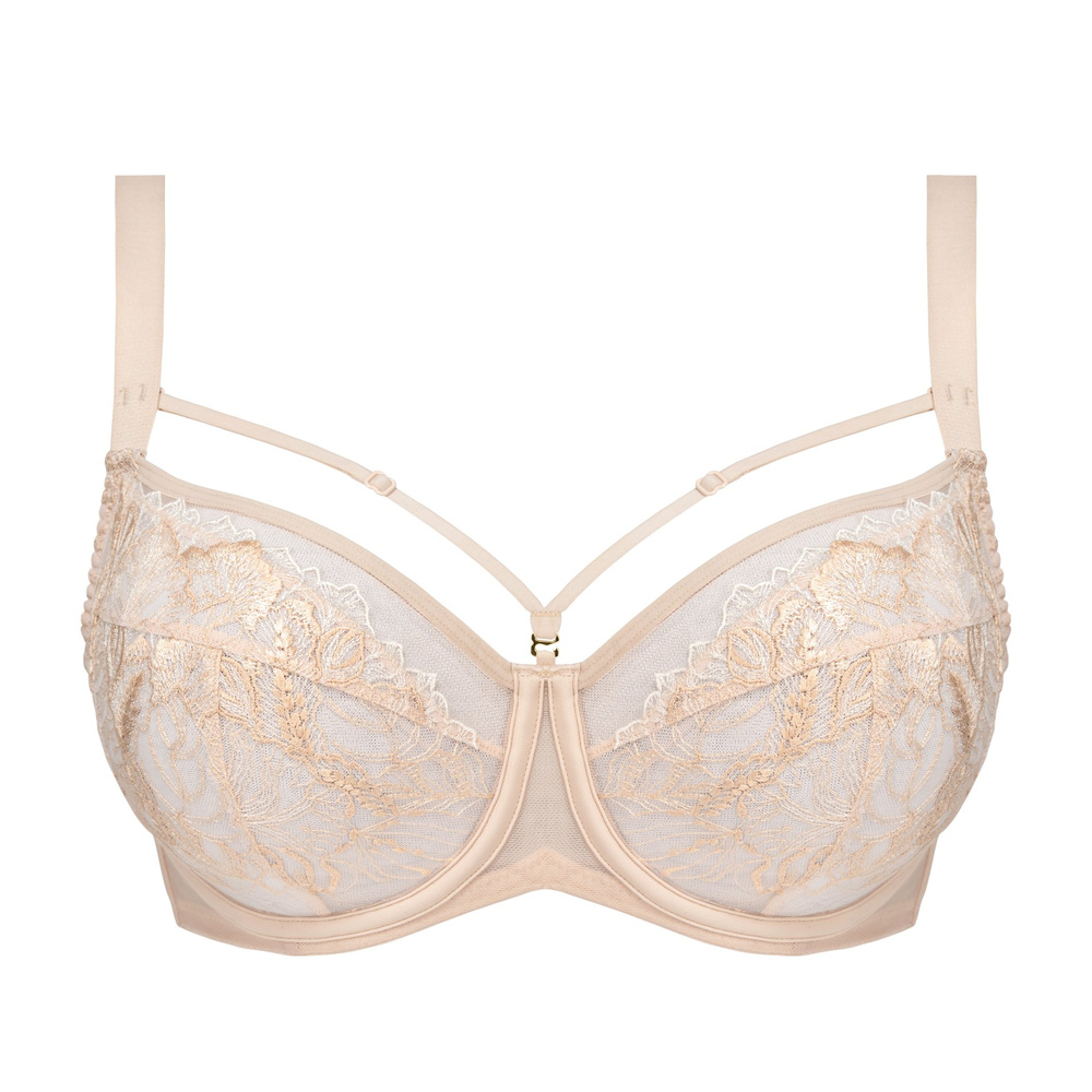 Ozdobne paski umieszczone w dekolcie dodają biustonoszowi nowoczesnego i zmysłowego charakteru, podkreślając kobiecy styl. Beżowy odcień sprawia, że model pozostaje dyskretny pod jasnymi ubraniami, a jednocześnie prezentuje się wyjątkowo efektownie.