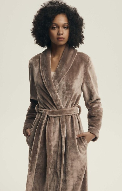 Szlafrok damski Henderson Dextra 43595 to propozycja dla kobiet ceniących elegancję i wygodę. Uszyty z miękkiej, aksamitnej w dotyku dzianiny, zapewnia ciepło i komfort przez cały dzień. Klasyczny szalowy kołnierz, długie rękawy oraz wiązanie w pasie sprawiają, że model doskonale dopasowuje się do sylwetki. Funkcjonalne kieszenie i efektownie zaokrąglony dół dodają mu praktyczności i kobiecego charakteru. To szlafrok, który sprawdzi się zarówno na poranne chwile relaksu, jak i wieczorny odpoczynek.