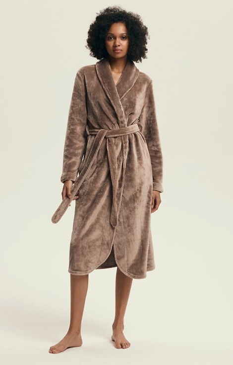 • Този елегантен дамски халат е с яка тип шал и връзки на талията. Изработен от мека плетена материя, той е идеален за по-хладните дни.