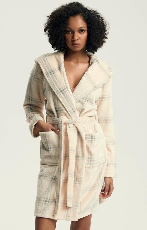 • Дамски халат, изработен от мека плетена материя, с качулка и джобове. Карираният модел добавя нотка чар.