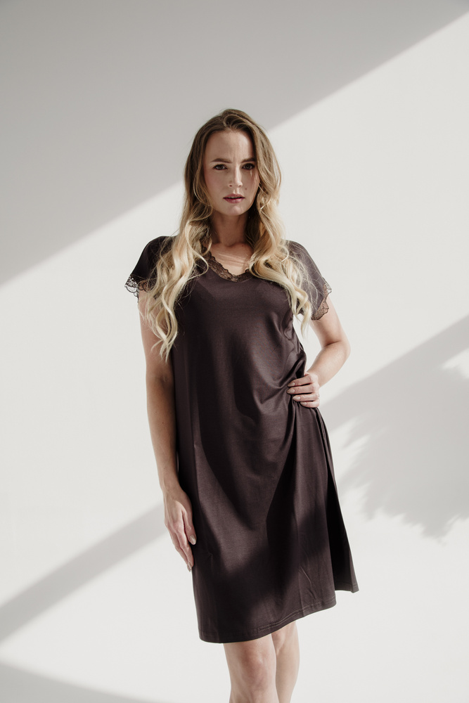 Елегантна дамска тениска с къс ръкав. Модел, изработен от висококачествена вискоза. Деколте и презрамки, украсени с дантела с флорални мотиви. Той ще се хареса на жените, които обичат мекотата и свободата.