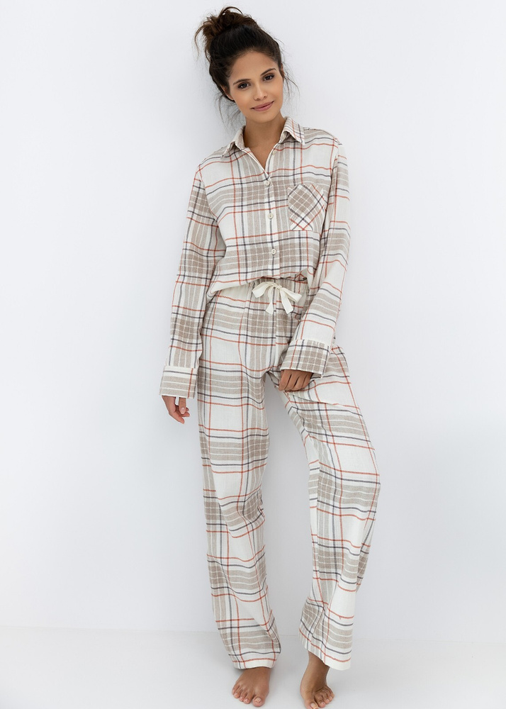 • Елегантна дамска пижама Adalyn Sensis, изработена от висококачествен памучен фланел. Риза с яка и дълъг панталон в класически кариран десен гарантират комфорт и стил.
