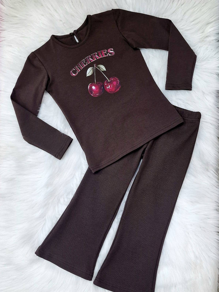 Блуза за момичета Cherries Bambarillo, цвят тъмен шоколад - памук, дълъг ръкав, с щампа