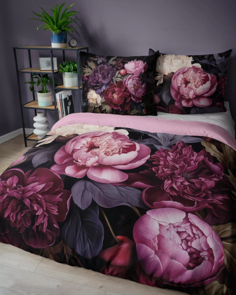 5129 Комплект спално бельо от памук Holland Detexpol, черен с божури в нюанси на бордо и розово – 100% памук, двустранен, полско производство