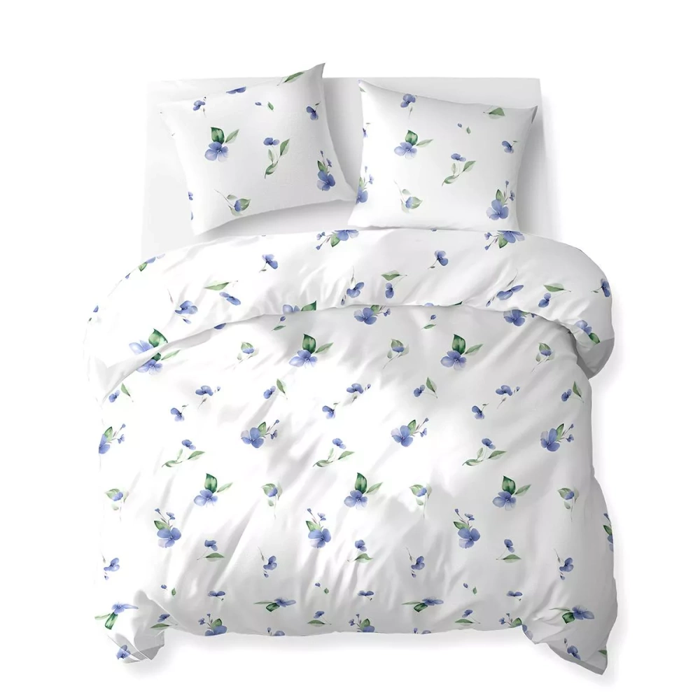 5769 B Cotton Bloom Комплект спално бельо Detexpol от памук, бял със сини цветя и зелени листа – 100% памук, двустранен, полско производство