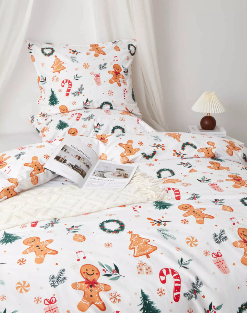 - Елегантно спално бельо от микросатен I25 с празничен мотив. Меко, деликатно и приятно на допир, микрофибърът осигурява комфортен нощен сън и създава празнична атмосфера в спалнята.