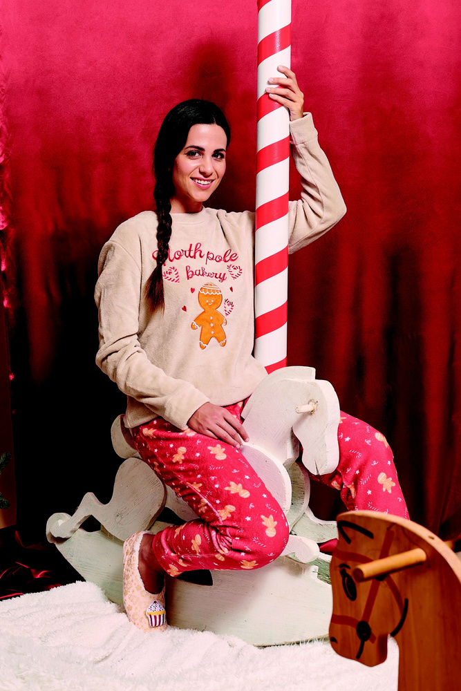 • Пижамата Meddy Sorbetto, изработена от мек коралов полар, ще ви обгърне в празничен стил. Суитшъртът е с изображение на люлеещо се конче с надпис „Ginger Horse“, а панталоните са с джинджифилови бисквитки и бонбонени бастунчета.