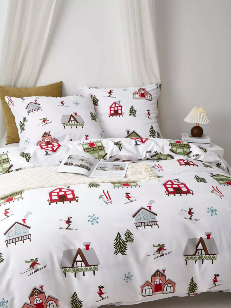 Коледно спално бельо от памучен сатен „Ски“ от Spod Igły i Nitki бяло, червено, зелено – елегантно и меко