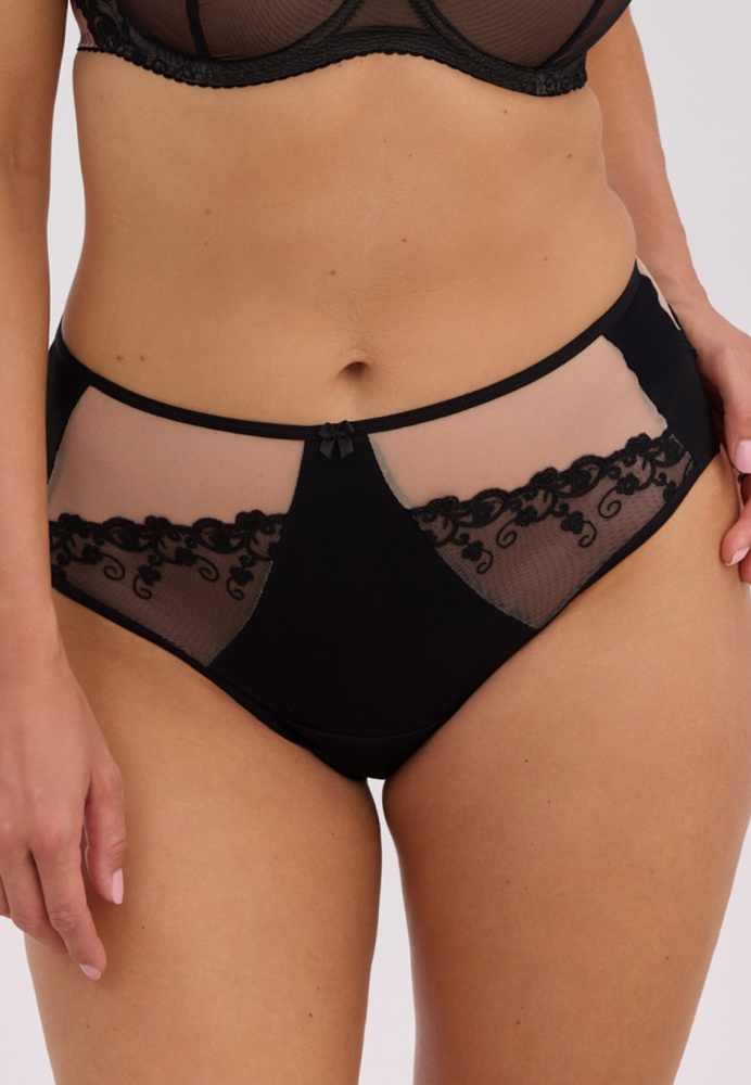 Прецизно проектираният фасон подчертава линията на ханша, без да прави компромис с комфорта и сигурността. Комбинацията от мока и черно изглежда стилно и неподвластно на времето. Моделът се съчетава перфектно със сутиен от серията Gaia Fatma, създавайки хармоничен и елегантен комплект бельо.