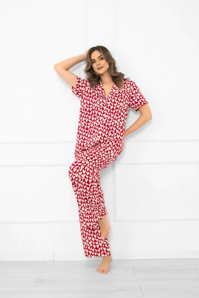 Пижамата Ksenia е създадена за жени, които ценят комфорта, естествените материи и стилния домашен външен вид. Изработена от 100% висококачествен памук, тя е мека, дишаща и изключително приятна за кожата. Свободната кройка осигурява удобство по време на сън и почивка, а очарователният принт със сърца придава женствен и топъл характер.