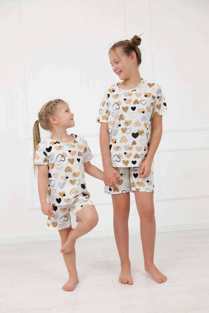 Пижамата е изработена от висококачествен естествен памук, който е мек, дишащ и щадящ чувствителната детска кожа. Материята не предизвиква раздразнения, поддържа се лесно и запазва формата си след многократно пране. Очарователният десен със сърца придава момичешки чар и прави пижамата любима за всяка вечер.