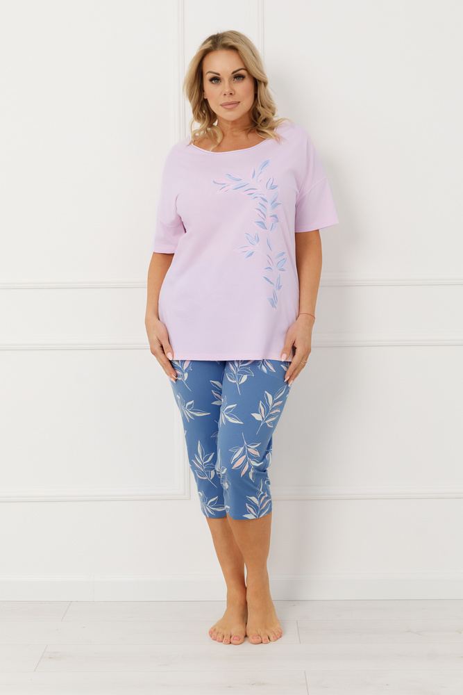 Горната част на комплекта е блуза с къс ръкав и класическо обло деколте, завършено с фина контрастна кантовка. Тази конструкция не стяга в областта на врата и раменете и осигурява удобна, свободна посадка. Дискретният флорален принт, разположен от едната страна, придава лекота и женствен характер, без да доминира визията. Долната част са панталони с дължина 3/4, украсени с растителен мотив и снабдени с две практични странични джобчета, което прави пижамата функционална и като домашно облекло.