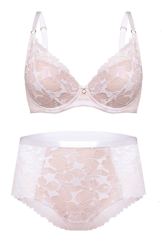 Бикините са изработени от деликатна флорална дантела, подплатена с бежова еластична мрежа, която осигурява мекота към кожата и по-добра дискретност под светли материи. Високият, пълен крой и широките, добре покрити страни дават усещане за стабилност и комфорт, без свиване или навиване. Предната част с плоска, еластична лента се адаптира към талията и не се отбелязва под дрехите, а гръбът, завършен с дантела, придава лек и женствен завършек.