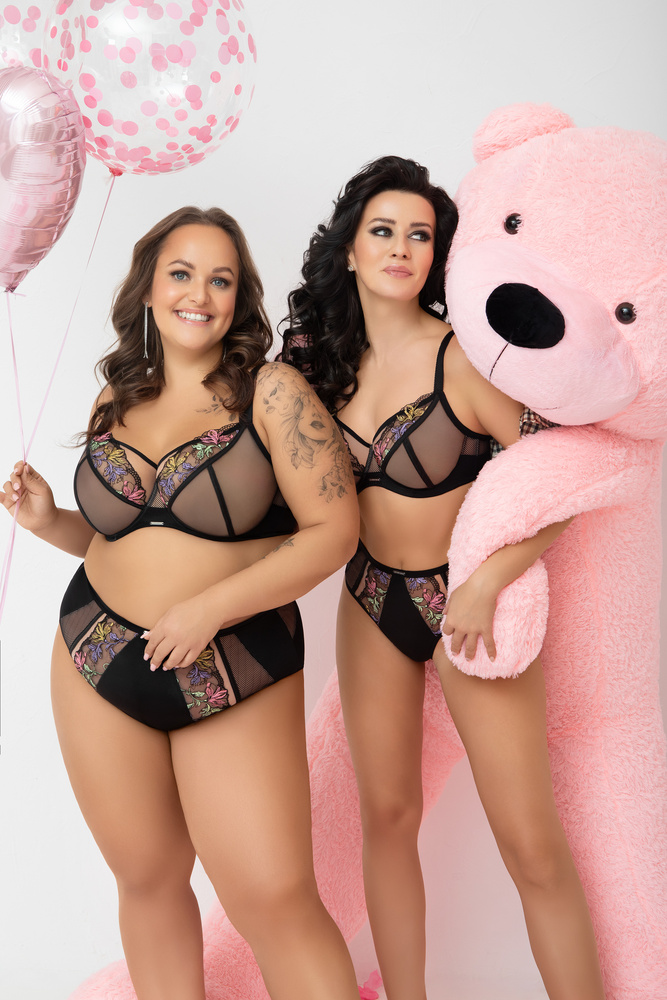 Сутиенът е изработен с триделни чашки от черен тюл, подплатени с бежова мрежа, които осигуряват стабилна форма и естествено закръгляне на бюста. В горната линия чашките са украсени с цветна бродерия с флорален мотив, придаваща лекота и женствен акцент. Конструкцията е проектирана така, че горният ръб на чашката преминава плавно в презрамката, което значително подобрява повдигането и разпределението на тежестта.
